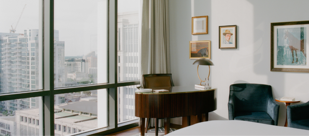 The classic, signature Swexan room with every detail and comfort you’d expect. Natural light, 10′ ceilings, floor-to-ceiling windows provide uninterrupted sweeping views of the Dallas skyline; 400 thread count Frette sheets, 5-fixture bath and walk-in shower.